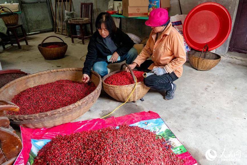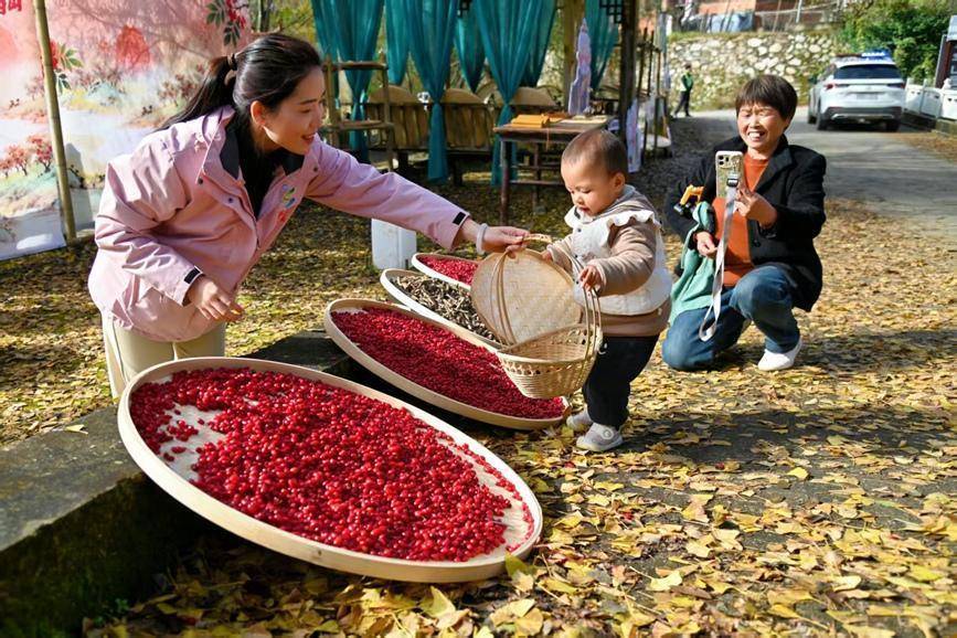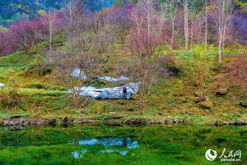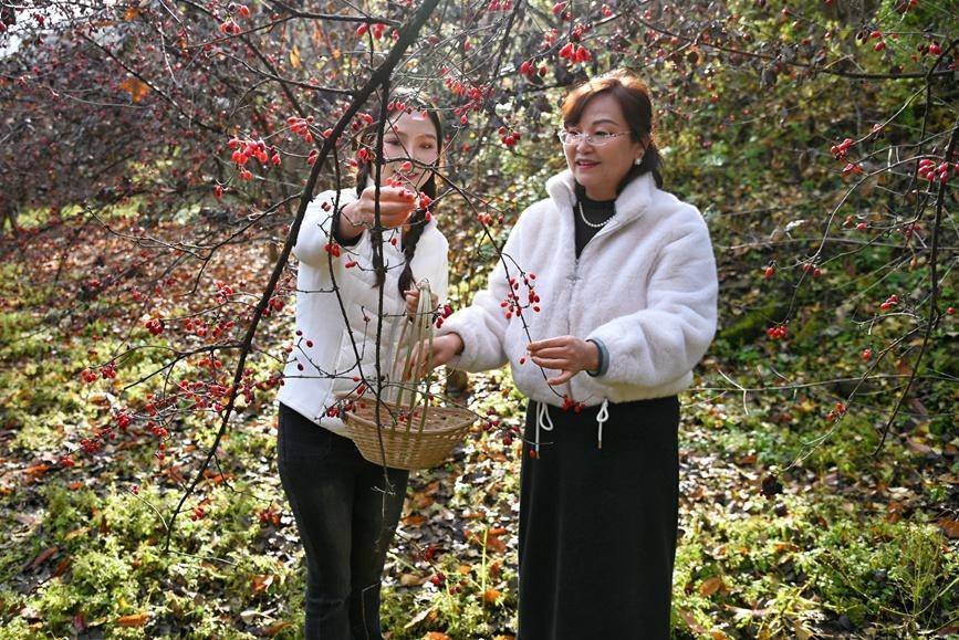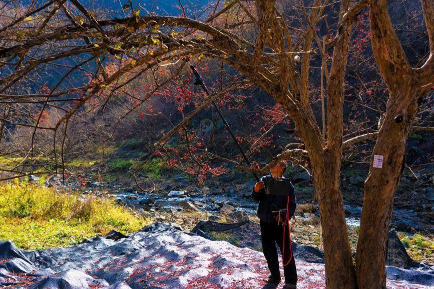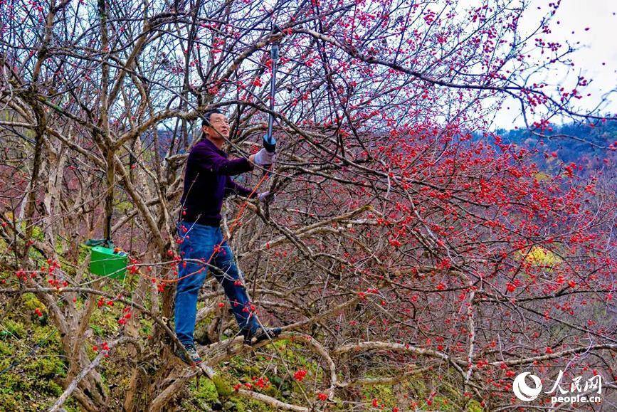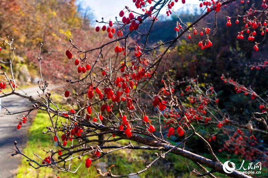 药农采摘山茱萸果。人民网 程明辉摄人民网郑州11月18日电 (程明辉)初冬时节,伏牛山层林褪去葱茏,漫山山茱萸尽染丹红,河南省西峡县二郎坪山茱萸基地迎来丰收旺季。半山间,晶莹饱满的红果缀满枝头,山风掠过枝桠,独特的淡香在山间悠悠漫溢。