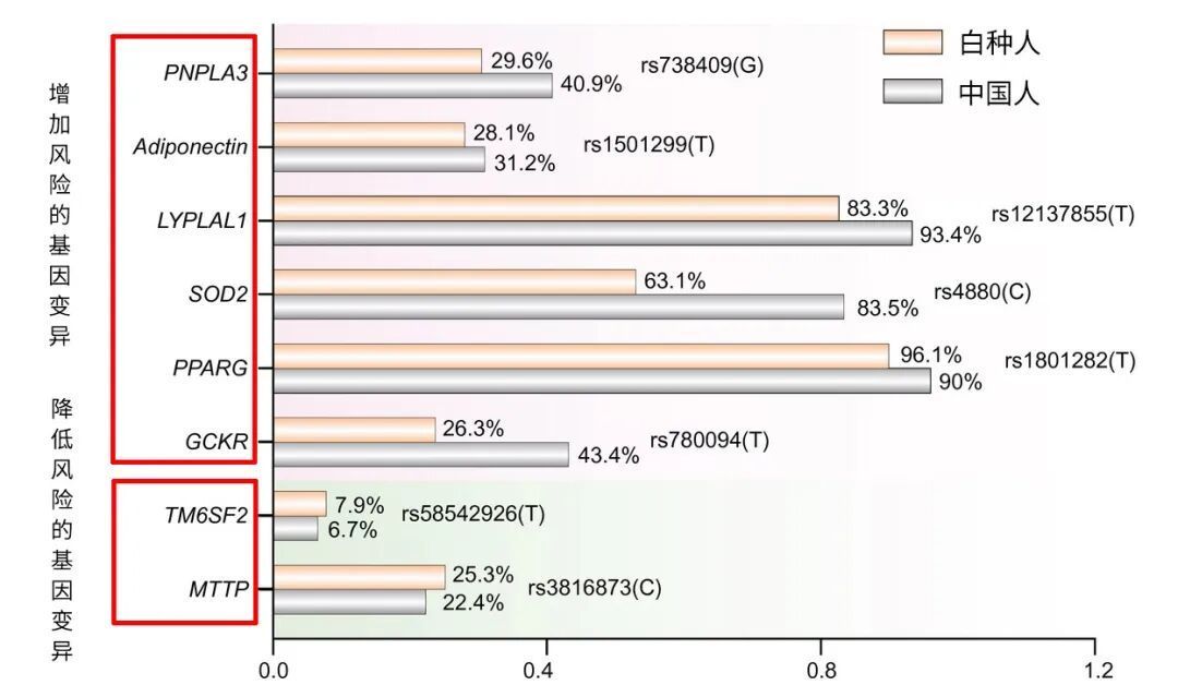 会增加或降低非酒精性脂肪性肝病风险的部分基因变异,以及它们在不同人群中出现的频率。中国人群中一些会增加患病风险的基因变异频率较高(如PNPLA3基因的rs738409:G、脂联素基因的rs1501299:T、LYPLAL1基因的rs12137855:T、SOD2基因的rs4880:C、PPARγ基因的rs1801282:T、GCKR基因的rs780094:T);而一些降低患病风险的基因变异频率则比白种人群低(如TM6SF2基因的rs58542926:T、MTTP基因的rs3816873:C)丨原图:参考资料2