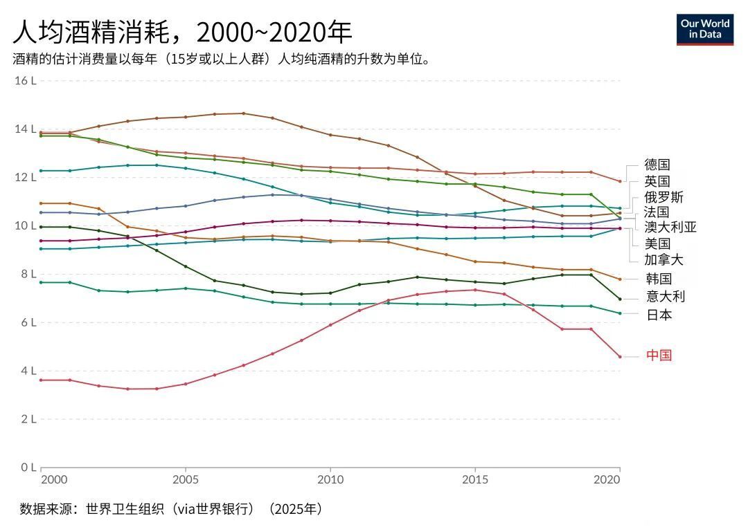 2000~2020年部分国家人均酒精消耗丨原图:参考资料3