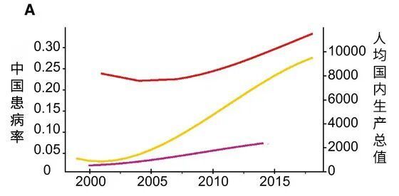 图中红线、黄线、紫线分别为中国非酒精性脂肪性肝病(NAFLD)患病率、人均GDP、肥胖率随时间的变化。丨原图:参考资料2