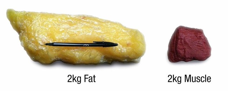 (图片仅为示意,不代表真实体积对比)平均而言,哺乳动物肌肉的密度约为1.1kg/L,脂肪的密度约为0.9kg/L,同等重量下,肌肉体积更小。丨X@tanay_mandowara