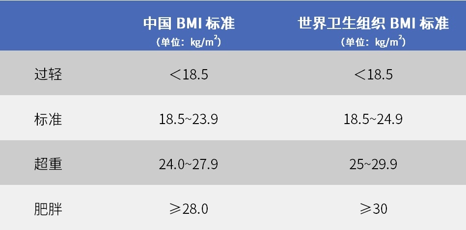 目前,衡量超重和肥胖程度最常用的指标是身体质量指数(BMI)。它的计算方式是“体重(千克)÷身高(米)的平方”。对于我国成年人来说,BMI(单位:kg/m2)的参考值如下——