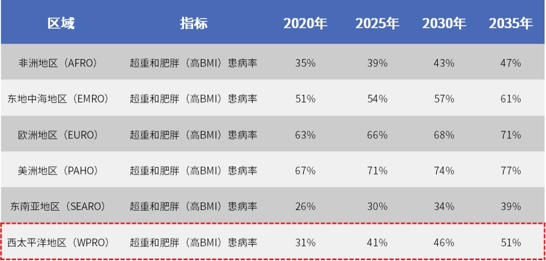 2020~2035年世卫组织区划成人超重和肥胖情况,其中2025、2030、2035年为预测数据丨整理自世界肥胖联盟《2024年世界肥胖报告》